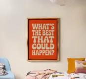 Design tipografico giocoso con la scritta "WHAT'S THE BEST THAT COULD HAPPEN?" in grandi lettere arrotondate color crema su sfondo arancione. Le lettere spesse e leggermente inclinate creano dinamismo, cordialità e una dichiarazione moderna e accattivante.