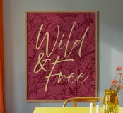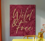 Citazione scritta a mano semplicemente "Wild & Free" su sfondo in grassetto di foglie tropicali.