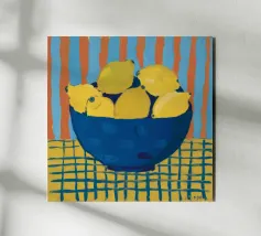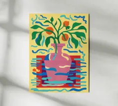 Un vivace bouquet di fiori e agrumi si trova in un vaso blu su un tavolo rosa. Lo sfondo è un mix dinamico di motivi a zig zag in bianco e nero e foglie verdi, che creano una natura morta moderna e giocosa.