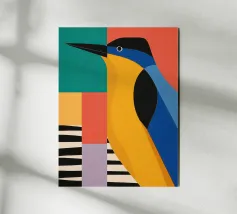 "Patchwork Perfection" cattura la vibrante bellezza degli uccelli, ciascuno ornato da un mosaico di motivi colorati. Questa stampa d'arte celebra l'armonia della tavolozza della natura attraverso intricati dettagli di piume.