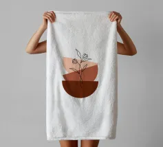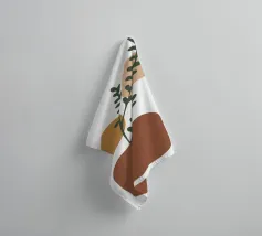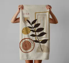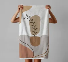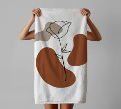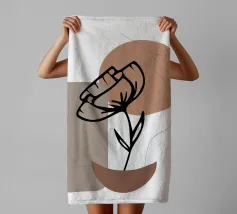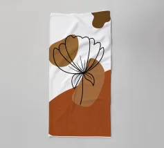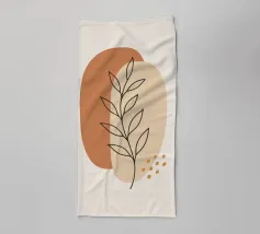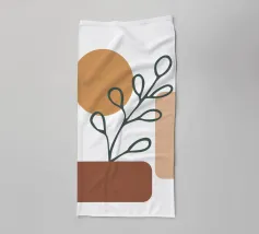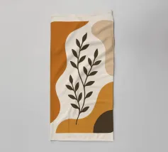 Una composizione astratta presenta un semplice sfondo geometrico marrone e beige con un delicato disegno al tratto di un ramoscello frondoso. Il design minimalista enfatizza gli elementi naturali in un equilibrio armonioso.