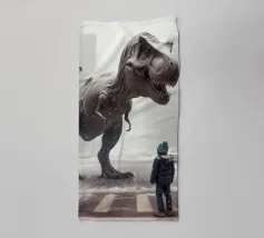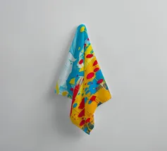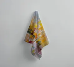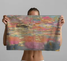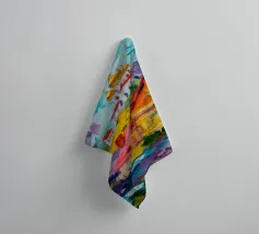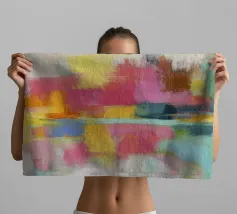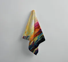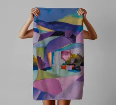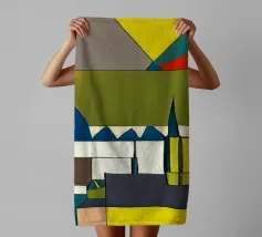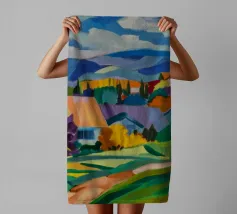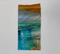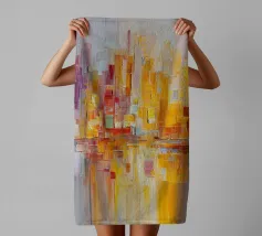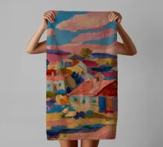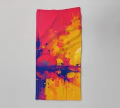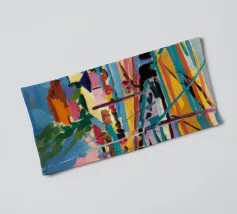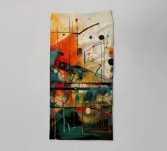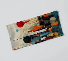 Quadro astratto dinamico che presenta un'architettura surreale, vivaci toni arancioni e blu, alberi astratti e sfere fluttuanti in un paesaggio fantastico. I tratti strutturati e i contrasti decisi creano un'atmosfera onirica ed energica.