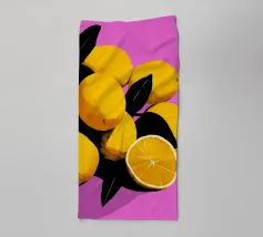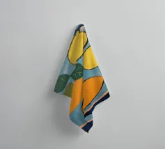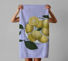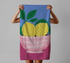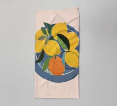 Una natura morta mediterranea con limoni e foglie verdi in tenui colori pastello è presentata in un motivo grafico a quadri. Questa illustrazione di ispirazione vintage dona un tocco di estate tropicale a qualsiasi cucina e celebra la freschezza di frutta e verdura biologica.