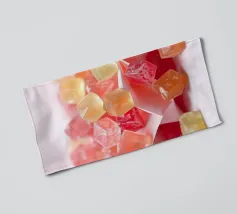 Un vivace mix di caramelle è distribuito su una superficie rosa, che mostra varie forme e colori, tra cui lecca-lecca roteanti e dolciumi rotondi. Questa disposizione giocosa invita a una gioiosa indulgenza.