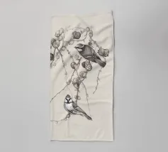 Un uccello è appollaiato su un ramo con grappoli d'uva viola circondati da foglie verdi. I colori vivaci dell'uva e delle foglie creano un contrasto sorprendente.