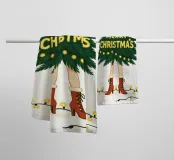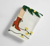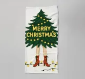 Divertente arte natalizia di una donna che indossa stivali da Babbo Natale e cerca di montare un albero di Natale. Le luci fiabesche cadono a terra mentre lei indossa l'albero di Natale.