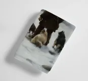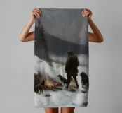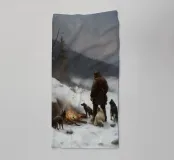 Un suggestivo motivo invernale: un cacciatore si trova con i suoi cani accanto a un falò riscaldante nel mezzo di un paesaggio montano innevato. L'immagine trasmette un senso di avventura, vicinanza alla natura e la tranquilla bellezza dell'inverno. I caldi accenti di luce del fuoco contrastano con il fresco paesaggio innevato e creano un'atmosfera suggestiva. Ideale per murales, tazze, cuscini o tessuti: un disegno unico per tutti coloro che amano l'aria aperta, la caccia, la natura e il romanticismo dell'inverno.