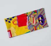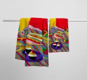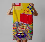 Una vivace illustrazione di una tavola imbandita con un'abbondante e colorata varietà di cibo, tra cui sushi e borse della spesa. La scena è una rappresentazione gioiosa dell'abbondanza e di un pasto soddisfacente dopo lo shopping.