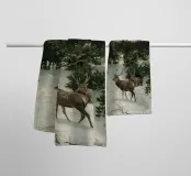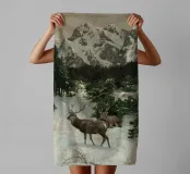 Un suggestivo motivo invernale: tre cervi si ergono maestosi in un paesaggio montano innevato, con abeti e cime sullo sfondo. I colori naturali e l'atmosfera tranquilla rendono questo disegno perfetto per gli amanti della natura e degli animali. Che si tratti di un murale, di un cuscino, di una tazza o di un poster, questo motivo porta il romanticismo invernale della fauna selvatica, l'eleganza e la tranquillità in ogni casa.