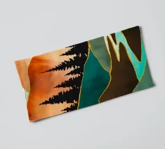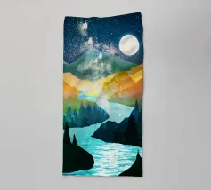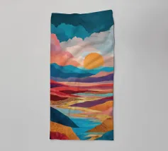 Si apre un paesaggio ipnotico, dove cime imponenti trafiggono un cielo pieno di sfere di luce. La scena è un tripudio di colori, con sfumature di arancio, rosa, blu e viola che si fondono senza soluzione di continuità. L'uso di linee spigolose e taglienti accostate a forme morbide e arrotondate crea una tensione visiva accattivante. Un fiume tranquillo si snoda nella valle, riflettendo i colori vibranti che la sovrastano. Quest'opera invita lo spettatore a esplorare un mondo in cui colore e forma danzano in perfetta armonia.