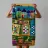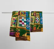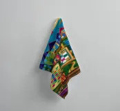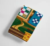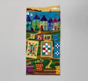 Illustrazione di una colorata città di mare, resa in uno stile che ricorda una trapunta patchwork. Le forme stravaganti e i colori vivaci creano un paesaggio affascinante, popolare e fantasioso.