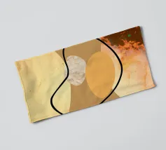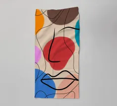 Un design minimalista presenta una linea nera continua che si intreccia con forme geometriche colorate, tra cui grandi cerchi di varie tonalità. Lo sfondo è un colore morbido e neutro che mette in risalto l'audacia degli elementi astratti.