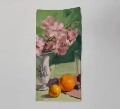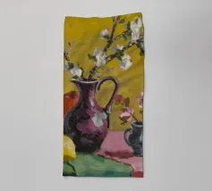 Un'audace natura morta con vivaci fiori rosso-rosa, forse papaveri o gerani, in un semplice vaso, accanto a fresche pere verdi, il tutto su una ricca tovaglia rossa che contrasta nettamente con uno sfondo blu intenso.
