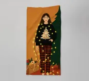 Illustrazione stravagante di una giovane donna a casa che decora il suo albero di Natale. Le luci natalizie sono aggrovigliate intorno al suo corpo.