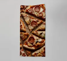 Diversi tranci di pizza sono esposti ad arte con condimenti vivaci come olive, pomodori e foglie di basilico fresco, creando un'invitante visione culinaria.