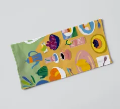 Illustrazione luminosa e allegra di un tavolo per la colazione illuminato dal sole, con caffè, succo d'arancia e pasticcini su un vivace sfondo giallo.