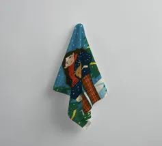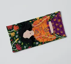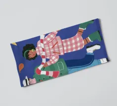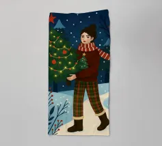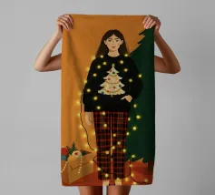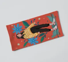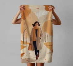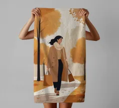 Una scena autunnale con una giovane donna che cammina lungo un sentiero che attraversa una colorata foresta autunnale. Lo sfondo è di un vivace azzurro cielo, che crea un contrasto deciso con le tonalità calde delle foglie e del fogliame autunnale. La donna indossa uno spesso maglione marrone, una sciarpa giallo senape avvolta attorno al collo e pantaloni a righe verticali arancioni, gialle e bianche che riprendono le tonalità autunnali circostanti.