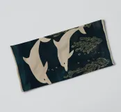 Due delfini che nuotano in acque blu profonde con morbide piante marine intorno a loro. I toni delicati e il movimento calmo creano una scena pacifica.