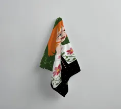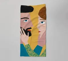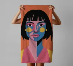 Questo dipinto raffigura una persona con i capelli neri che indossa un abito colorato con forme geometriche. Lo sfondo è rosso e la persona è adornata con grandi orecchini circolari.