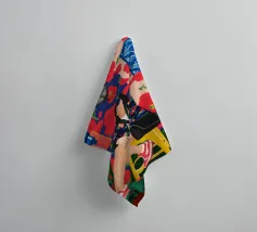 Questo dipinto raffigura una persona con i capelli neri che indossa un abito colorato con forme geometriche. Lo sfondo è rosso e la persona è adornata con grandi orecchini circolari.