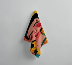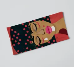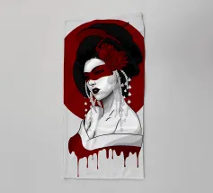 Questo dipinto raffigura una persona con i capelli scuri acconciati in due chignon, che indossa grandi orecchini arancioni. Il volto della persona è dipinto con audaci motivi rossi e bianchi, mentre lo sfondo è di colore rosso pieno.
