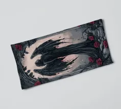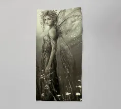 Una fata malinconica vestita di nero siede su un ramo nodoso e dall'aspetto antico. I lunghi capelli le ricadono sulle spalle e lo sguardo è abbassato dalla malinconia. Le ali strappate e trasparenti, che ricordano le foglie appassite, sono particolarmente suggestive. L'intera scena è caratterizzata da colori scuri, con forti contrasti tra le zone chiare della pelle e il nero profondo dello sfondo. L'atmosfera è misteriosa, triste e fiabesca, quasi come un momento di un romanzo dark fantasy.