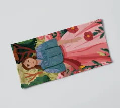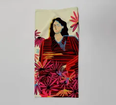 Un dipinto di una persona con un vestito a righe rosse e blu, circondata da fiori rosa.