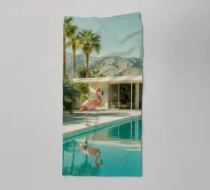 Una scena nostalgica di Palm Springs: un fenicottero rosa che nuota alla deriva in una piscina turchese, incorniciata da morbidi lettini pastello e palme svettanti. Quest'opera d'arte conferisce uno spirito estivo retrò, un'atmosfera vacanziera rilassata e un fascino di metà secolo a qualsiasi parete, ideale per soggiorni, camere da letto o per un arredamento elegante a bordo piscina.
