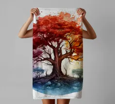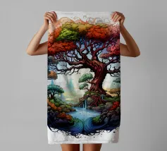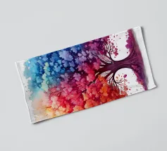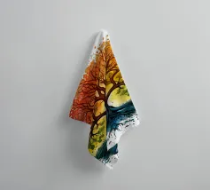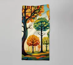 In superficie, un gruppo di alberi stilizzati esplode di colori, con le loro chiome che formano sfere di blu, arancione e giallo vibranti, alcune delle quali sono giocosamente divise in due metà contrastanti. Questo gioioso spettacolo di colori è rispecchiato da un'intricata rete di radici rosso intenso sotto la superficie, che simboleggia la forza nascosta e la connessione fondamentale che sostiene la vita. Le sfere colorate sparse aggiungono un'atmosfera stravagante ed energica, evocando un senso di meraviglia e di crescita. Perfetto per aggiungere un tocco di creatività e armonia naturale a qualsiasi spazio, questo pezzo celebra sia l'individualità che l'unità.