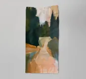 Paesaggio astratto dipinto con verdi profondi e calde tonalità della terra, che suggerisce un tranquillo sentiero nella foresta immerso in una luce soffusa.