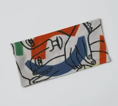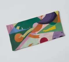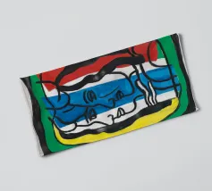 Questo dipinto mostra una composizione astratta con un mix di forme geometriche e organiche. I colori sono decisi e comprendono il nero, il blu, il rosso e il bianco. Le forme si sovrappongono e creano un senso di profondità.