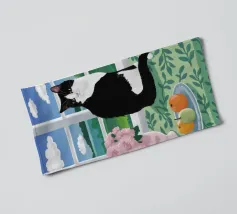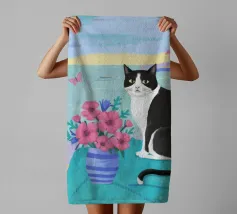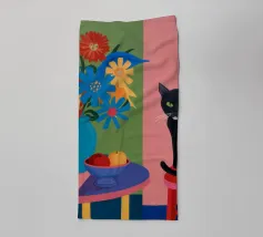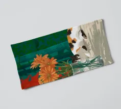 Un gatto bianco e nero siede regalmente dietro un grande vaso di fiori con motivi a strisce vivaci, sullo sfondo di una tenda rosa, creando una natura morta suggestiva e affascinante.