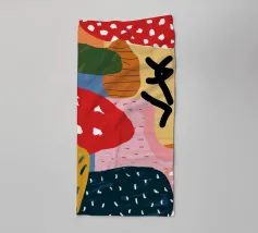 Un collage astratto vibrante ed eclettico caratterizzato da un mix di motivi audaci, tra cui righe, stampa ghepardo e pois. La composizione è un'espressione giocosa ed energica di uno stile moderno bohémien o massimalista.