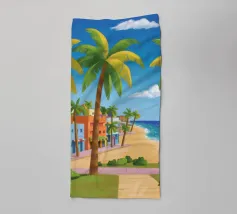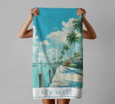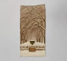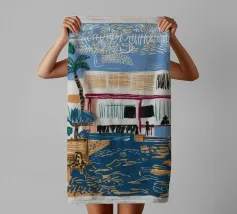 Un dipinto di un edificio modernista con un caratteristico tetto angolato, probabilmente in un luogo come Palm Springs, caratterizzato da linee pulite, palme e una fresca luce blu.