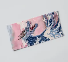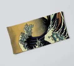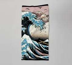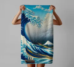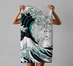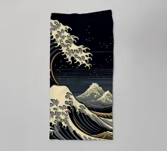 L'immagine raffigura un'illustrazione stilizzata in bianco e nero della Grande Onda al largo di Kanagawa, una famosa xilografia giapponese, con la Torre Eiffel sovrapposta all'onda. L'onda è raffigurata in un movimento dinamico e vorticoso, con creste spumeggianti e una base blu intenso. La Torre Eiffel si erge alta e slanciata, con la sua struttura intricata che contrasta con la forma organica dell'onda.