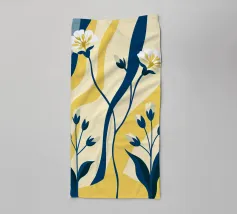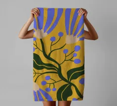 Un ramo stilizzato con foglie e bacche si staglia su uno sfondo astratto di forme blu, verdi e gialle. Le forme fluide e le morbide sfumature di colore danno un senso di armonia e di calma.