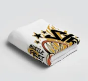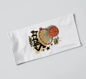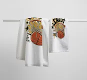Design urbano del basket con tipografia graffiti, tavolozza arancione e nera e canestro in rete. Uno stile street distintivo per abbigliamento sportivo e casual.