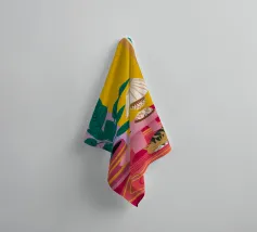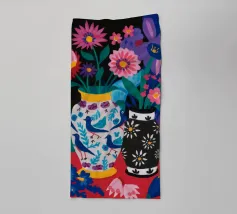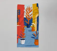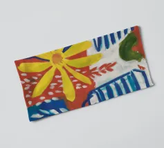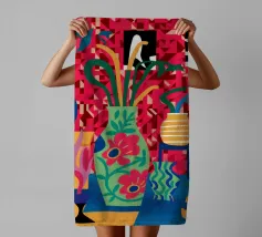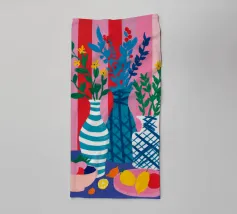 Una natura morta moderna ed eclettica con un paralume a scacchi, un vaso a zig zag e un fiore stilizzato. I motivi e le forme audaci creano una composizione divertente, grafica e di grande stile.