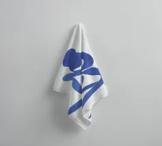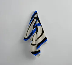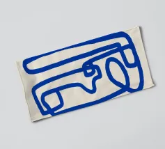 Una spessa linea blu serpeggia su uno sfondo neutro, creando un motivo astratto dalle forme audaci e curvilinee. La semplicità del disegno enfatizza il movimento e il flusso della linea continua.