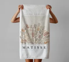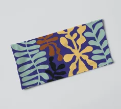 Un motivo di foglie stilizzate nei toni del verde, del rosa e della terracotta, ispirato ai ritagli di Henri Maraoui. La disposizione suggerisce una danza aggraziata di forme botaniche.