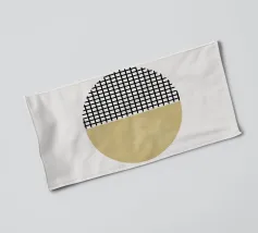 Opera d'arte geometrica minimalista con linee nere e un semicerchio di colore marrone con texture, su uno sfondo beige neutro e morbido.