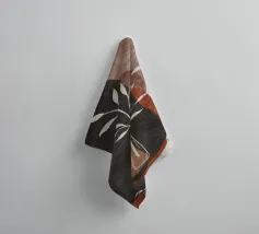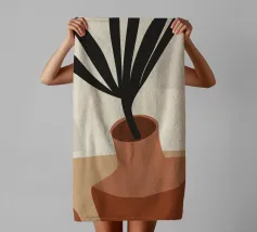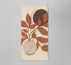 Il design minimalista è caratterizzato da una semplice pianta in vaso con foglie scure, contrapposta a forme astratte e sovrapposte nei toni terrosi del rosso, del grigio e del bianco. Le linee pulite e i blocchi di colore decisi creano un'estetica moderna e rilassante.