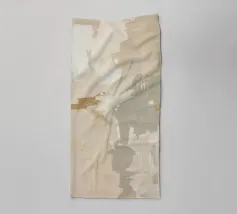 Moderna opera d'arte astratta con forme, linee e texture nei caldi toni della terra: marrone, ruggine, grigio e beige.