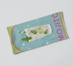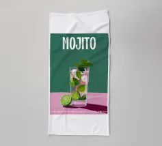 Un'illustrazione grafica brillante e vivace di un cocktail mojito in un bicchiere, con la tipografia 'Mojito' in alto, su un vivace sfondo verde lime.