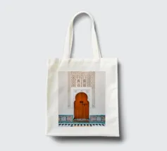 Architettura marocchina a Marrakech. Porta marrone con decorazioni intagliate e piastrelle colorate in nero, verde, arancio e blu.