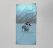 Il cagnolino dal pelo candido camminava sulla neve soffice. Sulla testa portava una calda sciarpa bianca, arrotolata intorno alle orecchie e alla fronte, e una maglietta blu, dall'aspetto carino e caldo. Piccole impronte erano impresse sul sottile strato di neve, lasciando dietro di sé piccole e graziose scie. I suoi occhi scintillavano, il suo piccolo naso nero si agitava nel vento freddo, creando un'immagine divertente e commovente nel mezzo della scena invernale.