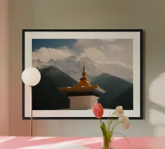 Un sentiero sterrato si snoda attraverso un campo aperto verso un piccolo villaggio himalayano, annidato alla base di imponenti montagne innevate. Due escursionisti si dirigono verso l'insediamento, il loro viaggio è incorniciato da un terreno accidentato e dal vasto cielo sovrastante. Il contrasto tra le tonalità della terra in primo piano e le cime ghiacciate sullo sfondo evidenzia la cruda bellezza della regione dell'Annapurna.