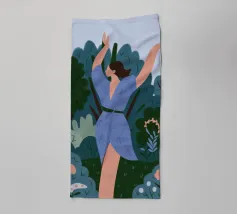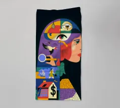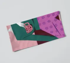 Questa opera d'arte mostra una persona seduta a un tavolo con una tazza davanti a sé. La persona indossa un abito con un motivo floreale colorato e lo sfondo è di un caldo rosa, creando un'atmosfera accogliente e riflessiva.