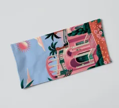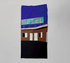Una classica insegna retrò "MOTEL" risplende contro un cielo serale blu intenso, affiancata da palme in primo piano. L'immagine cattura un'atmosfera nostalgica e cinematografica che ricorda un classico viaggio americano in macchina.