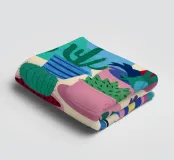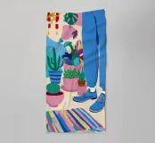 Un'illustrazione di una stanza vivace e in stile bohémien è assolutamente piena di una collezione di piante in vaso e cactus su un tappeto a righe colorate, creando un rifugio perfetto per un amante delle piante.